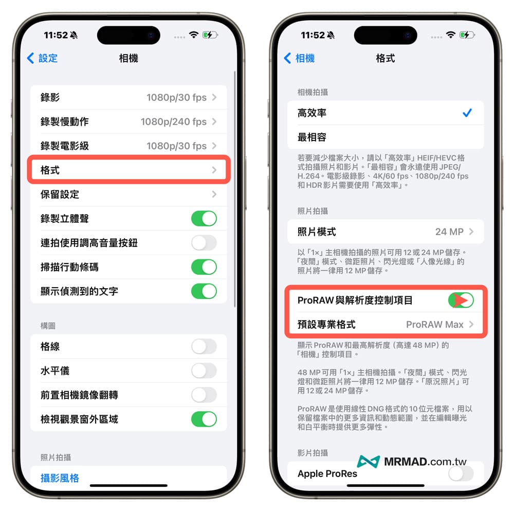 步骤 1. 开启iPhone 15 Pro / 15 Pro Max内置「设置」App,点入「相机」,并选择「格式」设置,并且将「ProRAW 与分辨率控制项目」功能开启。