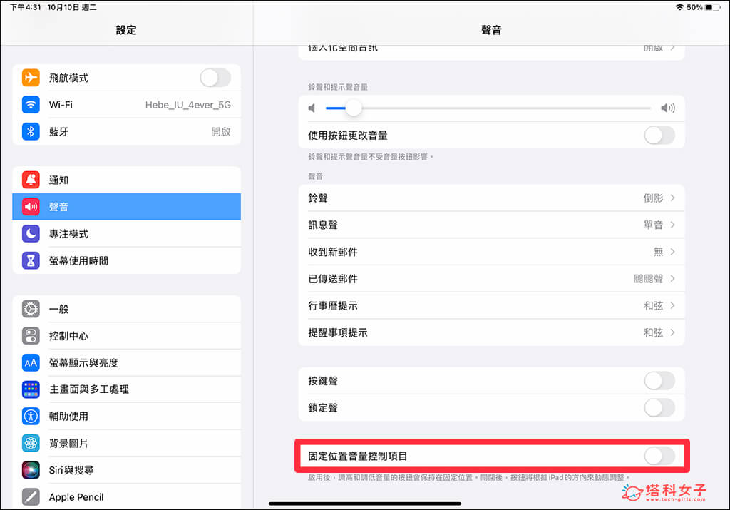 另一方面,如果你希望能让 iPad 音量按钮随方向变化,例如横向时,左边按钮变调低音量,右边按钮变调高音量,那我们只要关闭「固定位置音量控制项目」功能即可: