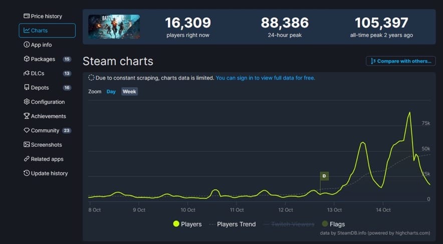 由于开启了免费游玩,《战地风云 2042》Steam同时Online峰值直线飙升,从免费前的5000人左右一路飙升到10月14日(周六)的近9万人,已经接近2年前的首次推出Online峰值10万人,但还是不能破纪录。