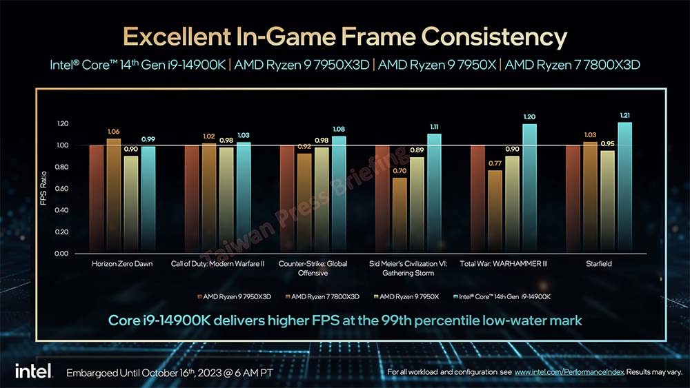 Intel 同步提供了多颗处理器的性能变现供参考,这里面包含与 AMD Ryzen 9 7950X3D 和 Ryzen 7 7800X3D 的比较。