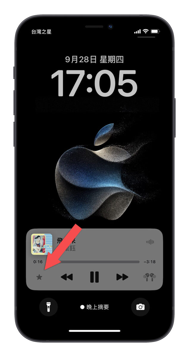 在 iOS 17.1 中,你可以从播放控制器右边的星星将听到不错的歌曲加入喜好收藏。