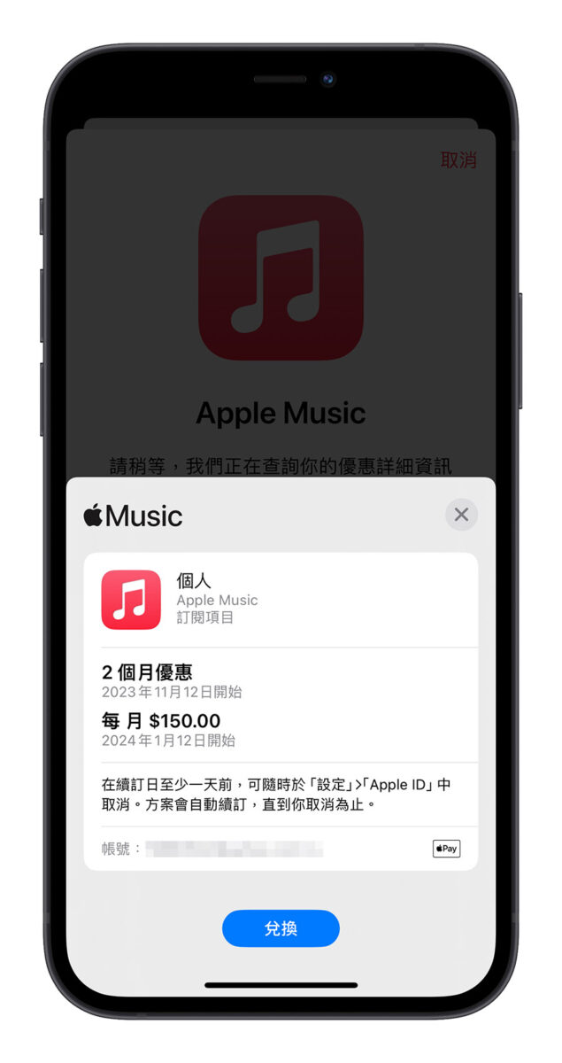 建议大家如果单纯只是想要试用的话,可以在兑换完毕以后就先取消,但你还是可以把试用期间听完,等到 2 个月以后就会自动取消、不能再听 Apple Music,这样也可以避免之后忘记取消续订 Apple Music 然后被扣款。