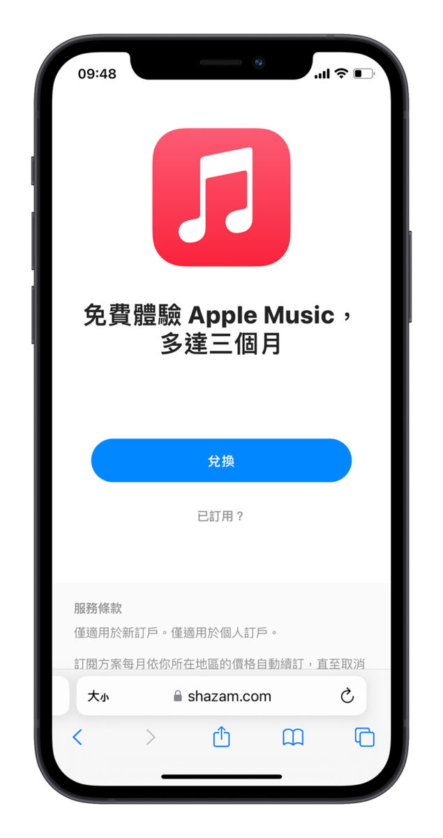 领取 3 个月免费体验 Apple Music 很简单,只要利用 Safari 浏览器打开 Shazam 官网,就会在底下看到「免费体验 Apple Music,多达三个月」的链接。