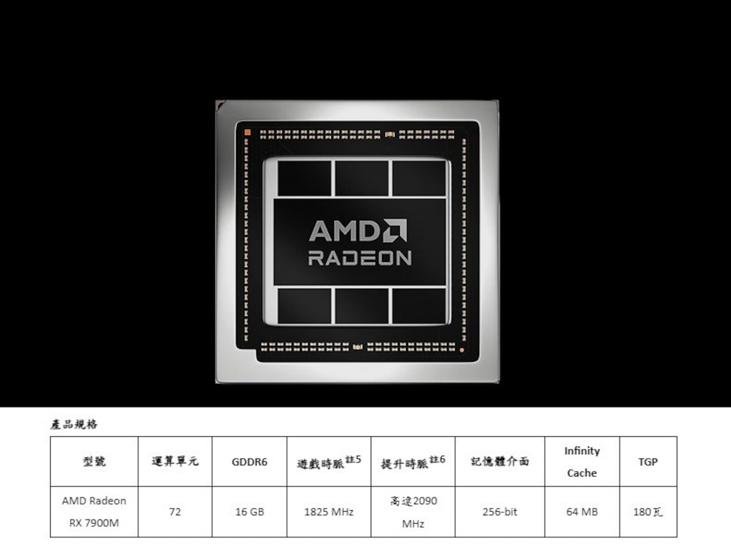 Radeon RX 7900M基于RDNA 3架构,具备AMD第二代光线追踪技术与支持Av1编码,配有72个CU与64MB Infinity Cache,游戏时脉达1,825MHz,规模介于Radeon RX 7800XT与Radeon7900 GRE之间,存储器为16GB 256bit GDDR6 ,能耗为180W等级。 AMD强调Radeon RX 7900M锁定1440p与以上分辨率游戏体验,并提供内容创作者充裕的效能与先进AV1编码能力。