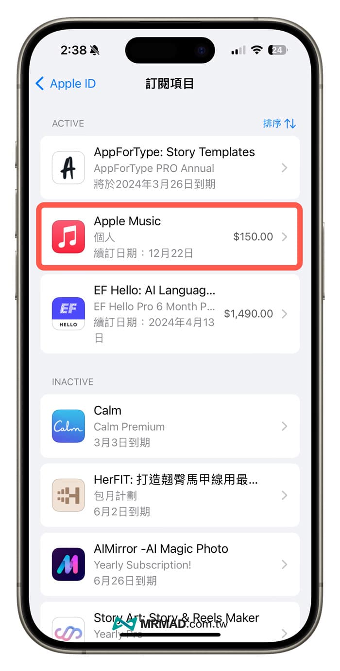 在订阅项目页面中会将所有Apple Music订阅方案全显示出来,同时也能看见Apple Music续订日期,只要在自动续订到期前取消Apple Music订阅,点击最下方的「取消订阅」按钮。