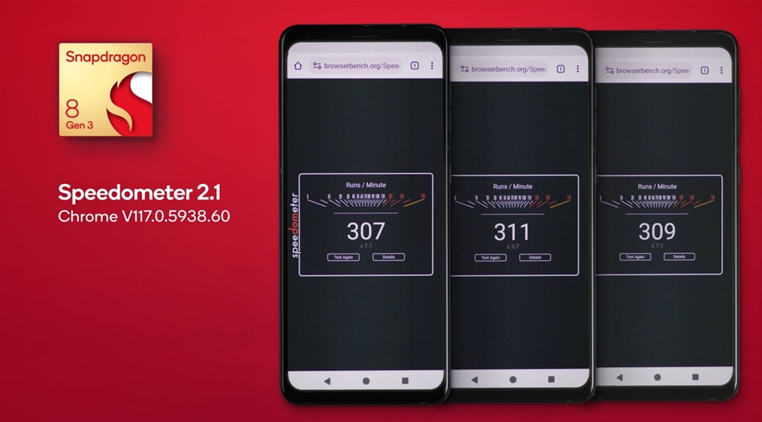 高通在Snapdragon Summit 2023公布新一代旗舰手机平台Snapdragon8 Gen 3,并简单提到相对Snapdrgaon8 Gen 2的CPU约有30%效能增长、20%能耗降低,GPU效能提升25%并减少25%能耗,AI则大幅提升98%并改善40%能耗效能比,同时虽维持在台积电4nm制程,但整体能耗仍有10%的提升; 不过这些笼统的数据相信对技术迷还是搔不到痒,高通也在正式发布Snapdrgaon 8 Gen 3的隔日公布21项常见测试软件的跑分表现,其中经常被视为指标的安兔兔一口气达到214万分的表现。