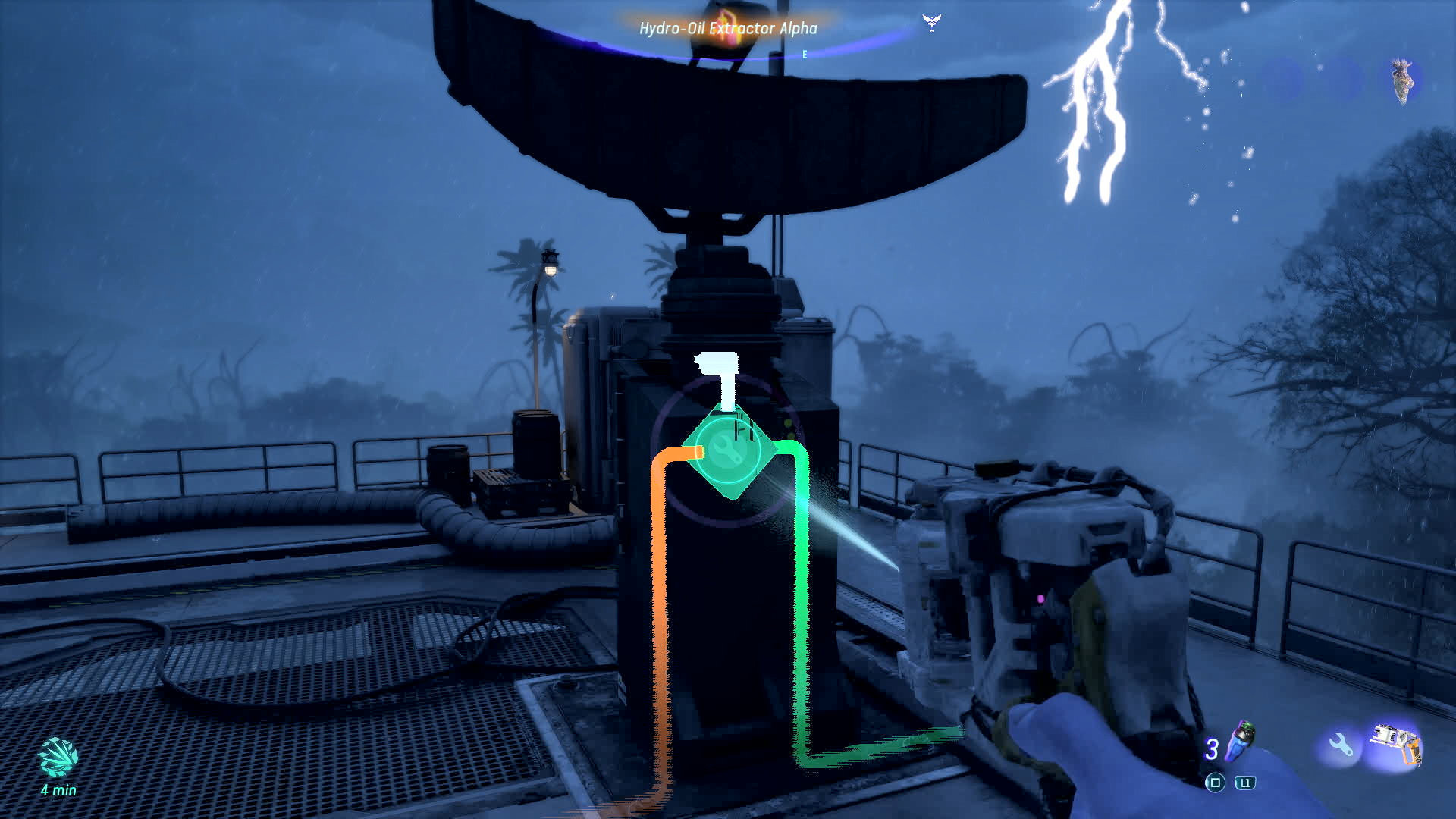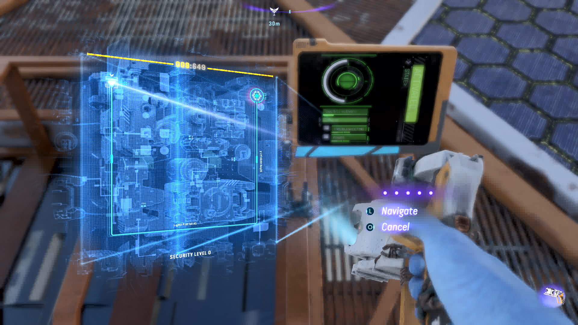 在排除威胁降落到空中平台之后,熟悉高科技的主角会使用扫描枪来破解敌人设备的系统,这部分是通过摇杆操控光标来通过数据链路抵达终点,将讯号输入核心系统,中间会需要通过启动开关等手段来排除障碍,这部分也是贯穿整个游戏的解谜类型之一。 后面还会有破解敌人的防空炮台来攻击敌人空中武力的桥段。