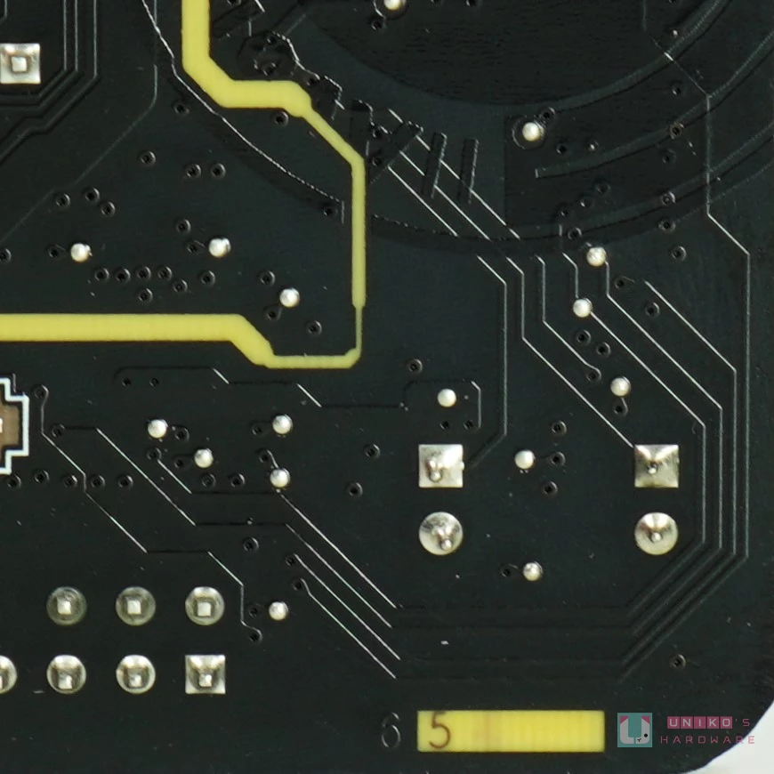 移除所有金属装甲后,黑色的PCB显露人前,元件遍布PCB各处。 PCB正面关于PCB板层数量的显示,由左至右有1 2 3的标示; PCB背面显示4 5 6,也就是6层板设计。 据微星官方介绍,新MORTAR II采用SERVER GRADE PCB(IT150GS)板材,并使用2OZ铜设计增强PCB散热效能和信号表现。