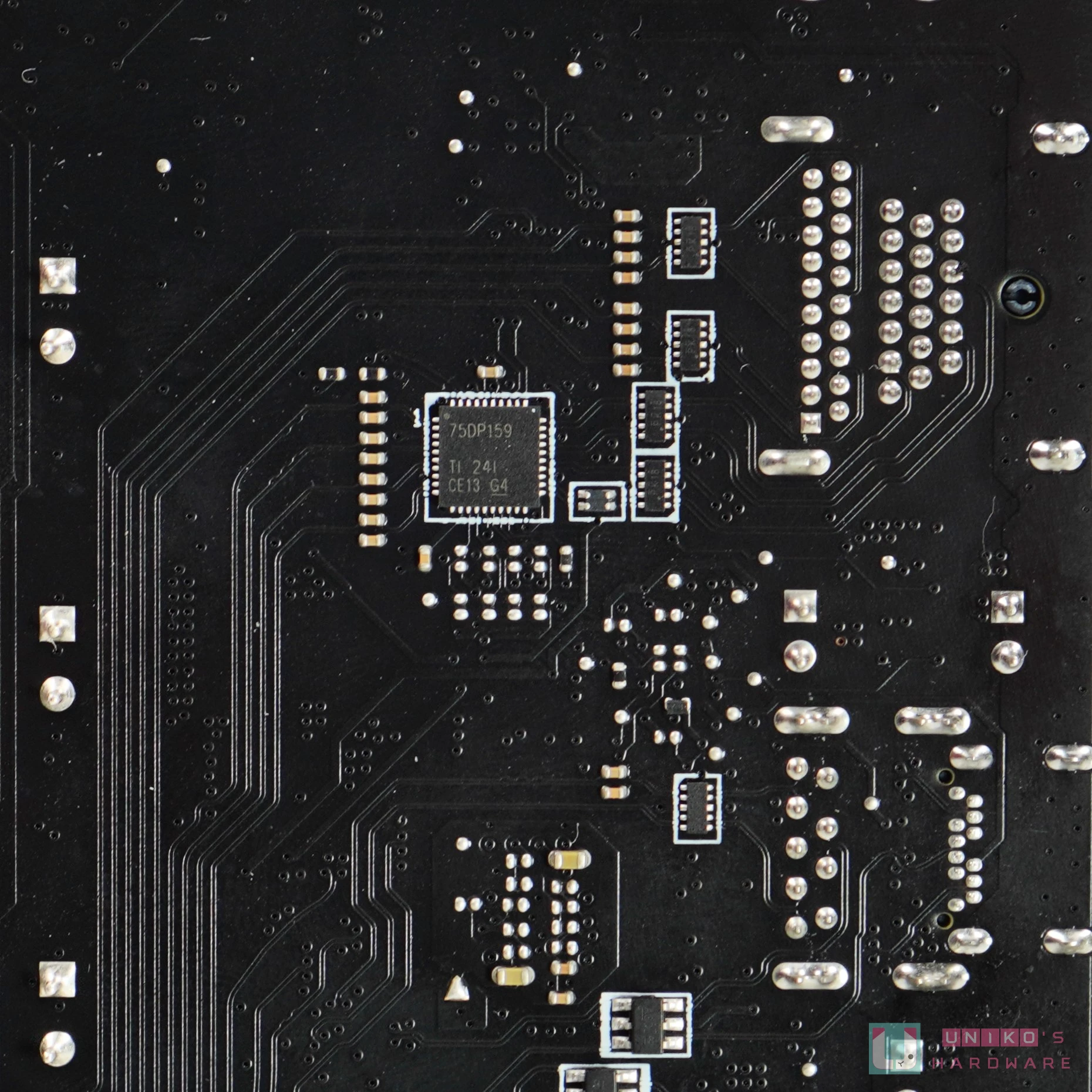 - TEXAS INSTRUMENT HD3220 是1颗 TYPE-C 控制器,内置 15W 充电功能,负责前置 10 Gbps TYPE-C,其中继器为 DIODES PI3EQX1002E (单 USB 10 Gbps) 以增强由 B760 芯片组至前置 10 Gbps TYPE-C 的讯号。