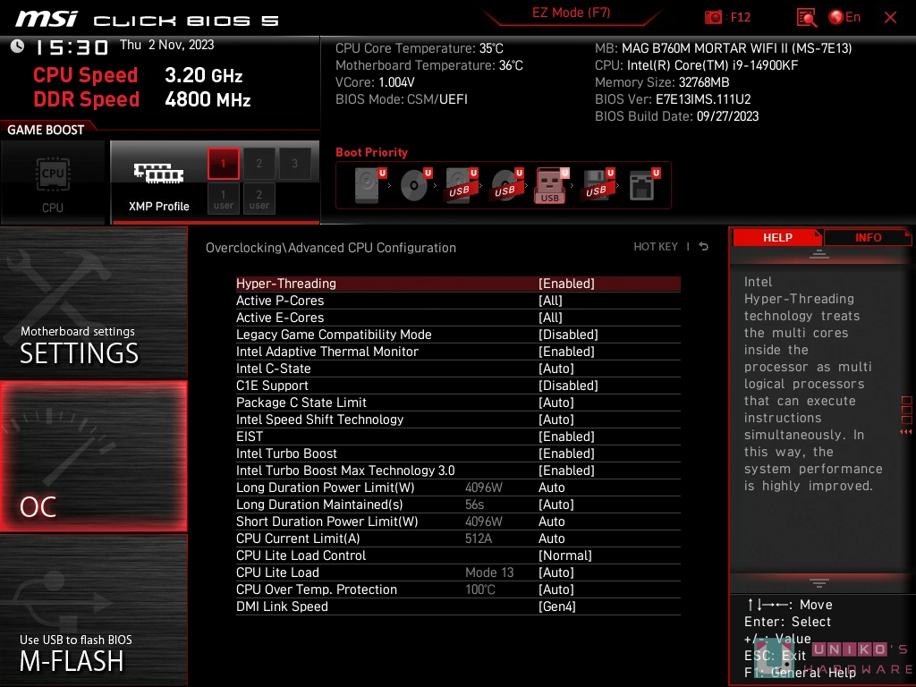 正因为是Corei9-14900KF搭配B760主板,所以大家就平常心看待就可以,BIOS的设置也相当简单,基本上就是打开XMP DDR5-7200,CPU Cooler Tuning处理器散热器调整就是设置在AIO水冷散热器,PL1就是最大化4096 W,进阶CPU设置也维持预设。