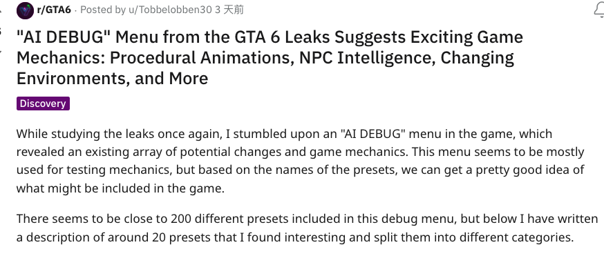 用户Tobbelobben表示他在研究泄漏的版本时发现了一个A.I Debug菜单,包含了海量的测试选项,但根据预设的名称,我们可以很好地了解游戏中可能包含的内容。