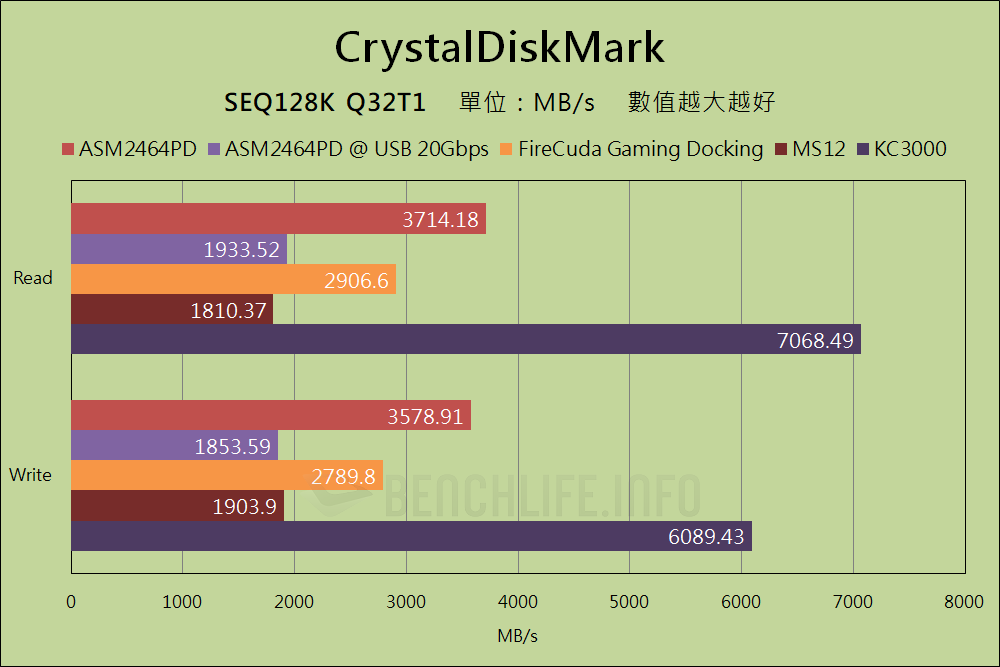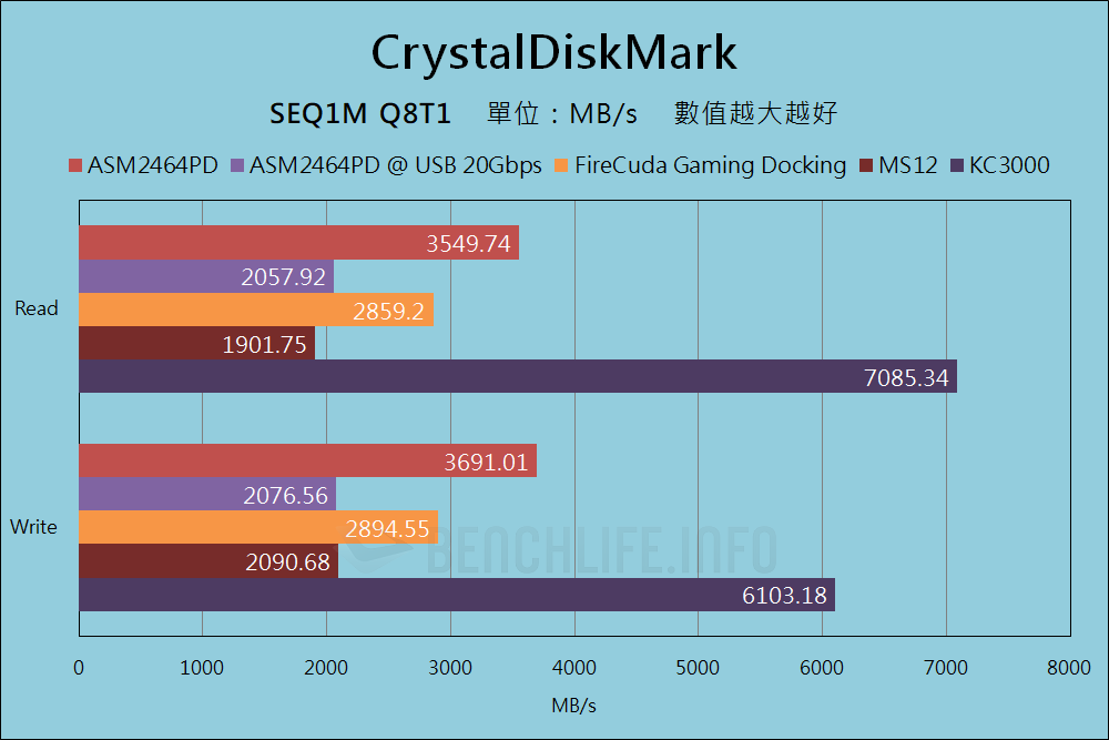 - 参考比较组、测试碟:Seagate FireCuda Gaming Docking(Intel JHL7440 Thunderbolt 3 控制器 )、SilverStone MS12(ASMedia ASM2364 USB 3.2 Gen 2×2 控制器)、KC3000 PCIe 4.0 NVMe M.2 SSD 1TB