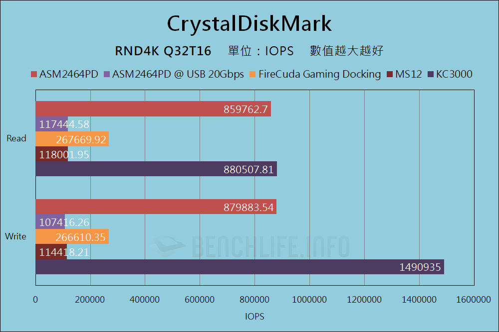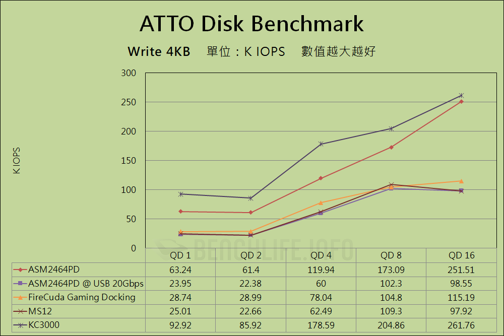 另外就4K随机存取IOPS吞吐量来看,USB4 PD100W(MS-4489)搭配ASM2464PD对上FireCuda Gaming Docking,在ATTO Disk Benchmark、CrystalDiskMark、Anvil’s Storage Utilities等测试内,动辄出现领先达倍数的结果。