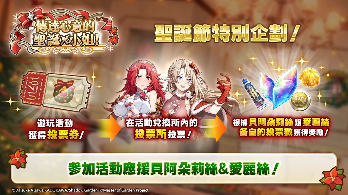 由大宇资讯旗下星宇互娱所代理之《我想成为影之强者! Master of Garden》,于 11/30 配合即将到来的圣诞节全球同步举办【传达心意的圣诞小姐! 】圣诞节限定活动,人气角色「贝阿朵莉丝」、「爱丽丝•米德加」也换上了符合圣诞节的衣装来欢迎各位闇影大人。