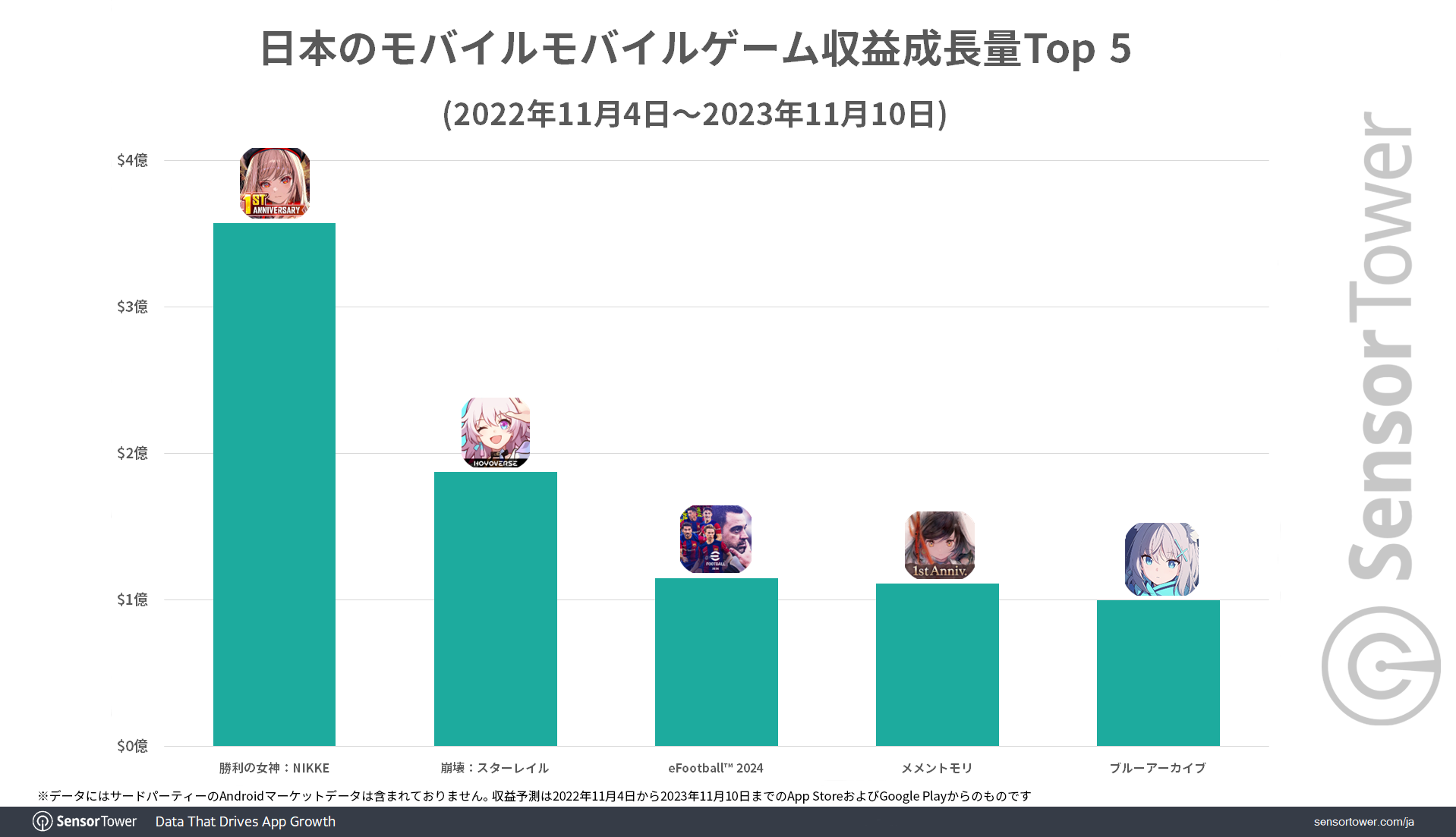 《胜利女神:妮姬》营收方面的表现在日本也十分亮眼。 根据Sensor Tower的数据,本作推出后至2023年11月10日为止的营收在日本手游市场中排名第五,此期间内榜上有第一名的《怪物弹珠》、第二名的《赛马娘 Pretty Derby》、第三名的《Fate/Grand Order》,在众多日本发行的手机游戏中, 本作是唯一进入 TOP5 的海外游戏。