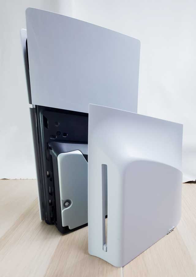 外壳比想象中容易拆下,不须拆除任何螺丝。 如果购买没有光驱的版本主机,可以额外购买PlayStation 5的专用光驱,把它安上,而游玩 PS5/PS4 光盘版游戏外,也支持播放 4K Ultra HD Blu-ray 蓝光影碟与 DVD 影碟。 M