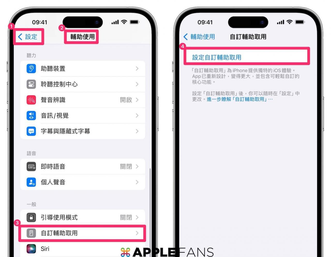 - 操作步骤:「设置」> 「辅助使用」>「自定义辅助取用」,选择「设置自定义辅助取用」功能